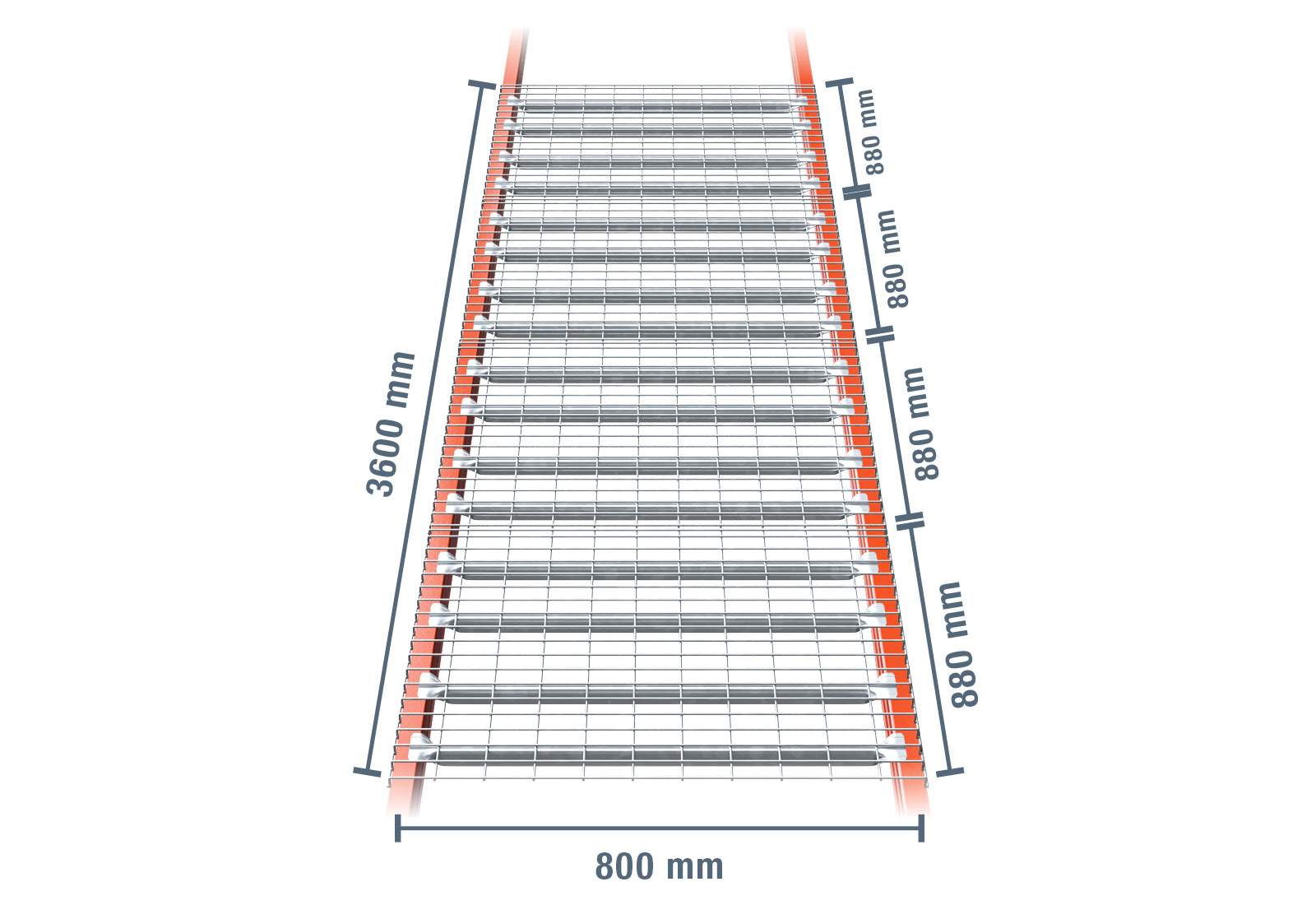 Questo supporto in rete metallica è composta da 4 moduli con una profondità di 800 mm e una larghezza di 880 mm. La larghezza complessiva è quindi di 360 cm. La capacità di carico massima di questa rete metallica è di 2.200 kg, con distribuzione uniforme del carico. Quando si carica il portapallet, rispettare i carichi massimi a scaffale e sul campo specificati del PR9000. Per l’impiego all’esterno, si consiglia di utilizzare lo scaffale con supporto grigliato in acciaio zincato a caldo.