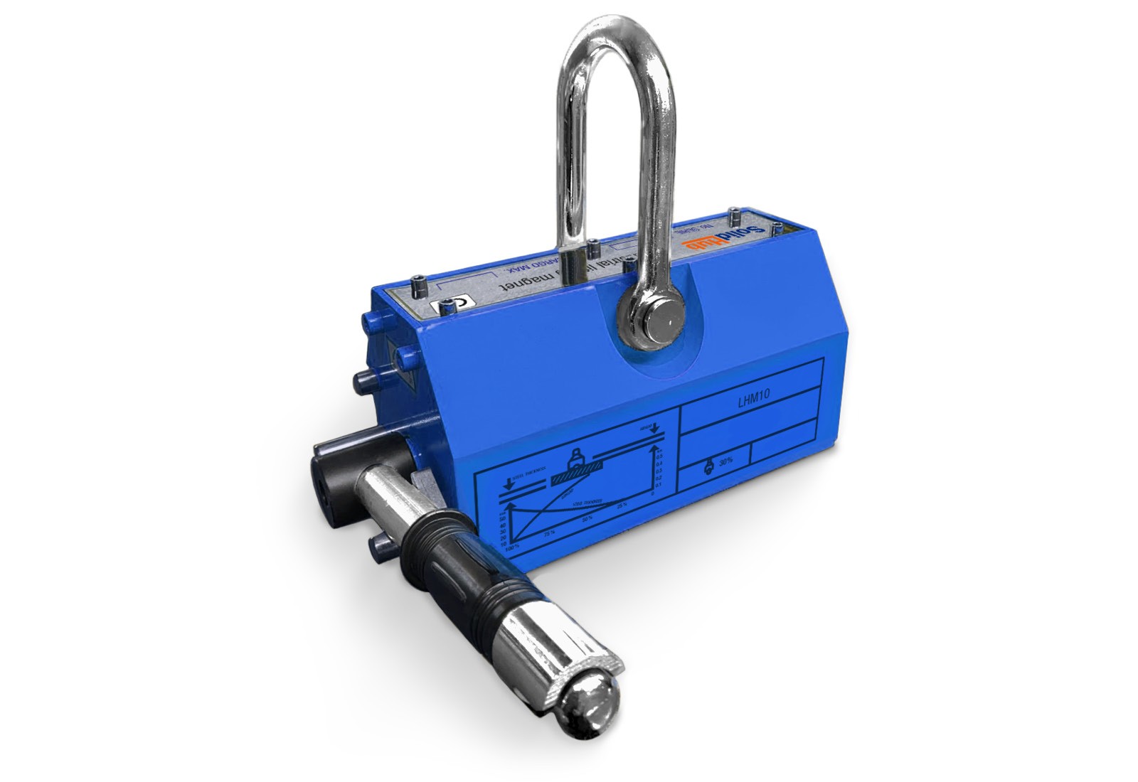 Da oggi TOPREGAL ha la soluzione: il magnete di sollevamento LHM10 che solleva carichi fino a 1.000 kg senza problemi. Tutto quello che dovete fare è posizionare il dispositivo sulla superficie liscia di una lamiera e girare la leva. La lamiera può essere successivamente alzata da una gru o da un altro dispositivo di sollevamento. Occorre soltanto agganciare un’imbracatura o un gancio al grillo di 70 mm di larghezza. Il peso ridotto di 33 kg del magnete di sollevamento compatto (230 mm x 410 mm x 260 mm) aiuta il trasporto e la manipolazione.