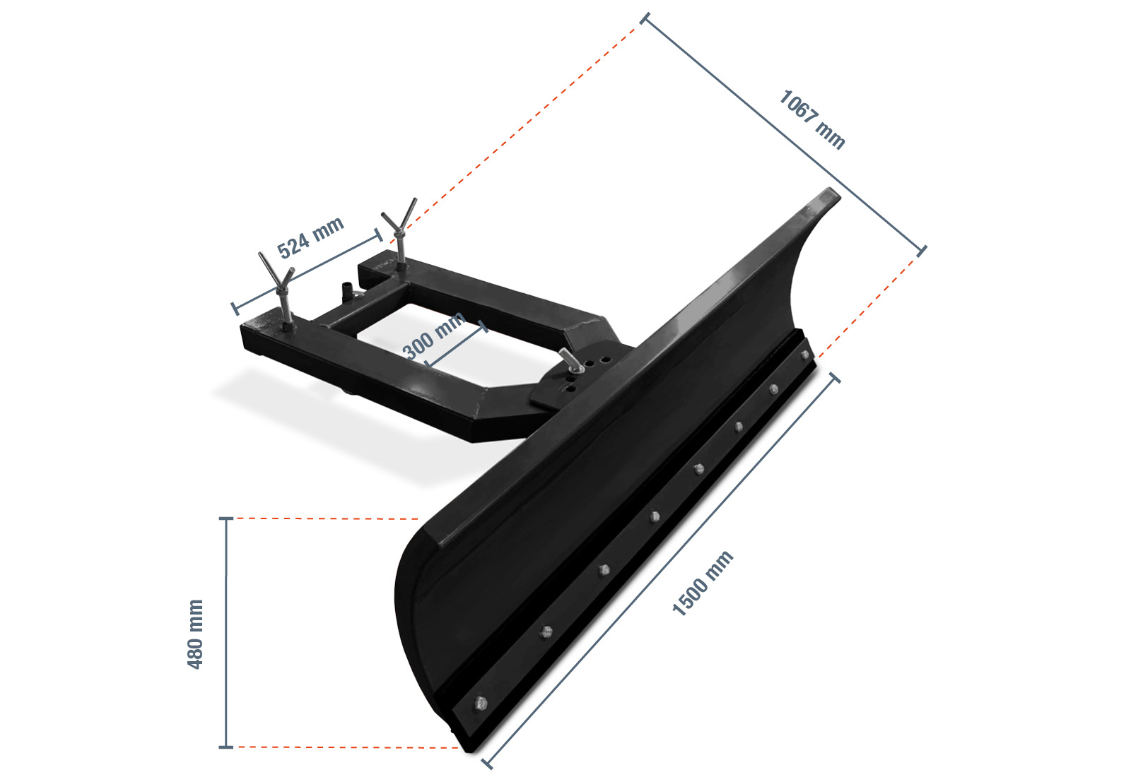 La lama da neve per il carrello elevatore è dotata di tasche per carrello elevatore da 130 × 55 mm. Le tasche distano 300 mm l'una dall'altra, quindi le forche del carrello elevatore devono essere regolabili in base a queste dimensioni. Assicuratevi che siano livellate orizzontalmente: il pratico supporto dello spalaneve vi aiuterà in questo senso. È sufficiente entrare, stringere le viti di bloccaggio e sollevare lo spazzaneve. Il carrello elevatore deve avere un peso di trazione di 2 tonnellate.