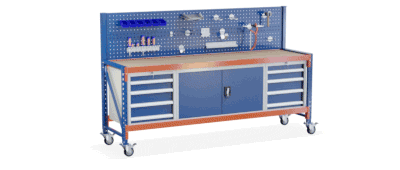 Nella gamma di accessori per banchi da lavoro, offriamo anche armadietti portautensili e cassetti portautensili integrabili come moduli opzionali. Gli armadietti/cassetti portautensili sono disponibili in due profondità per adattarsi al banco da lavoro selezionato. Sono dotati di serratura e sono realizzati in robusto acciaio. Le ante e i cassetti estraibili in blu si abbinano perfettamente alla scocca in un discreto grigio chiaro. All'interno dell'armadio portautensili è presente un ripiano che può essere agganciato a diverse altezze a seconda delle esigenze. Il secondo modulo, il cassetto portautensili, è composto da 4 cassetti, ognuno dei quali è dotato di un divisorio e può essere chiuso a chiave.