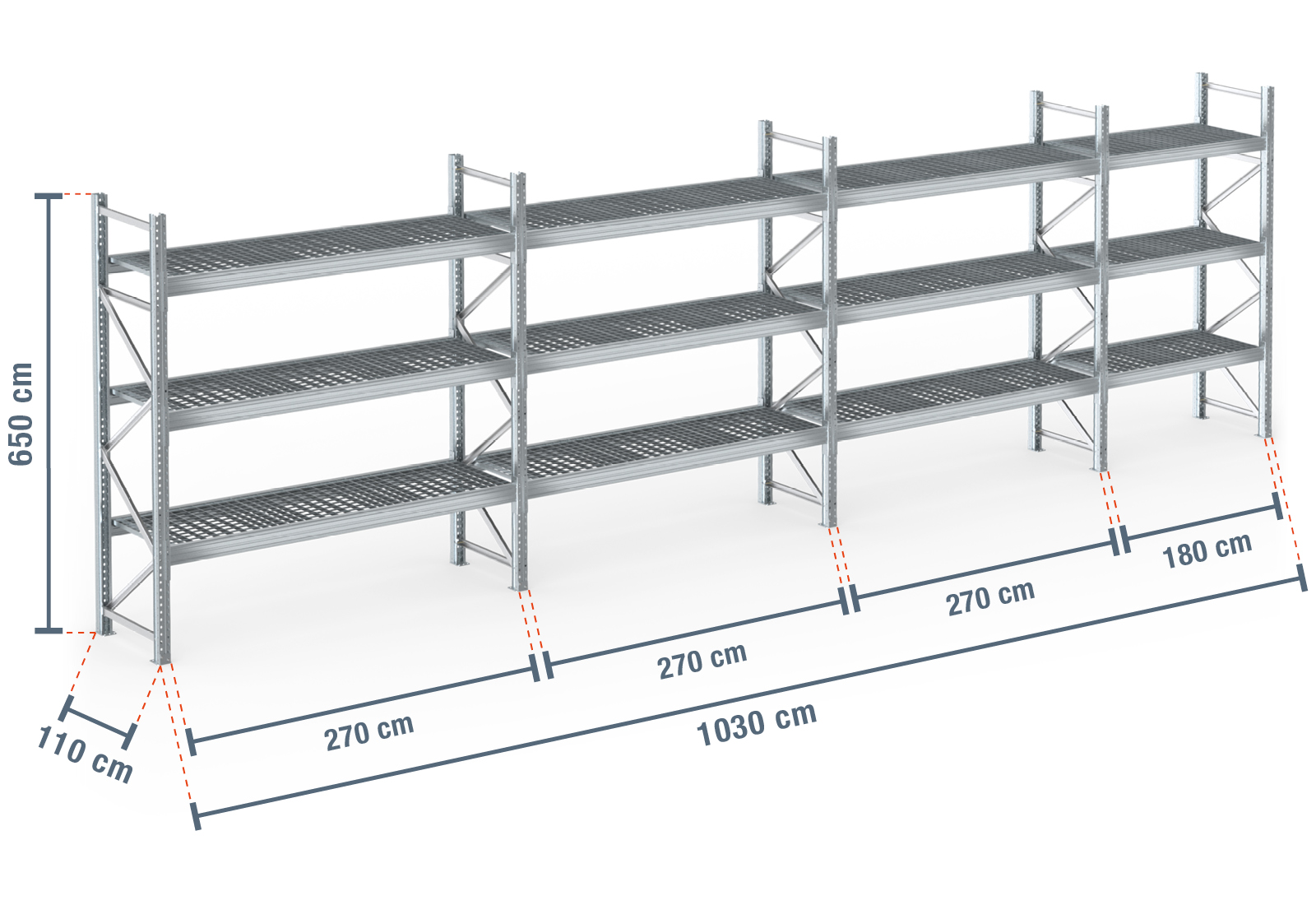 10,3 m scaffale portapallet PR9000F zincato a caldo / 110 cm profondità / 6,5 m altezza / 3 livelli / supporto grigliato