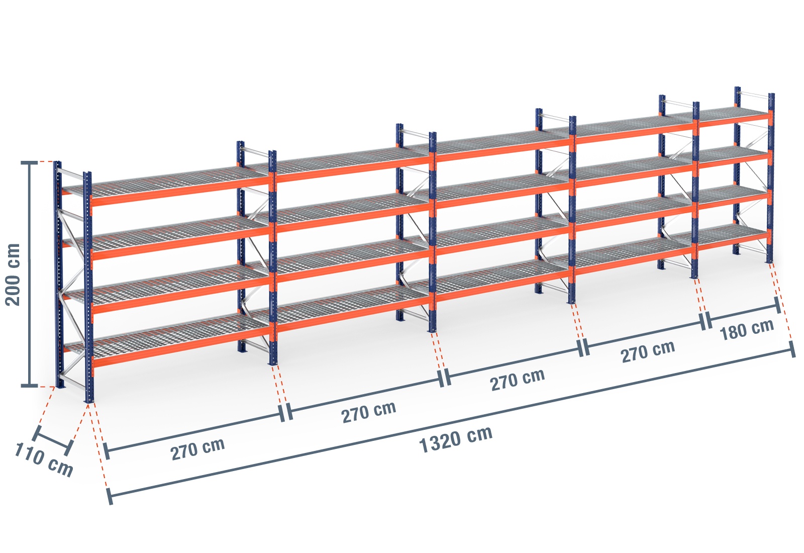 13,2 m scaffale portapallet da PR9000 / 110 cm profondità / 2 m altezza / 4 livelli / supporto grigliato