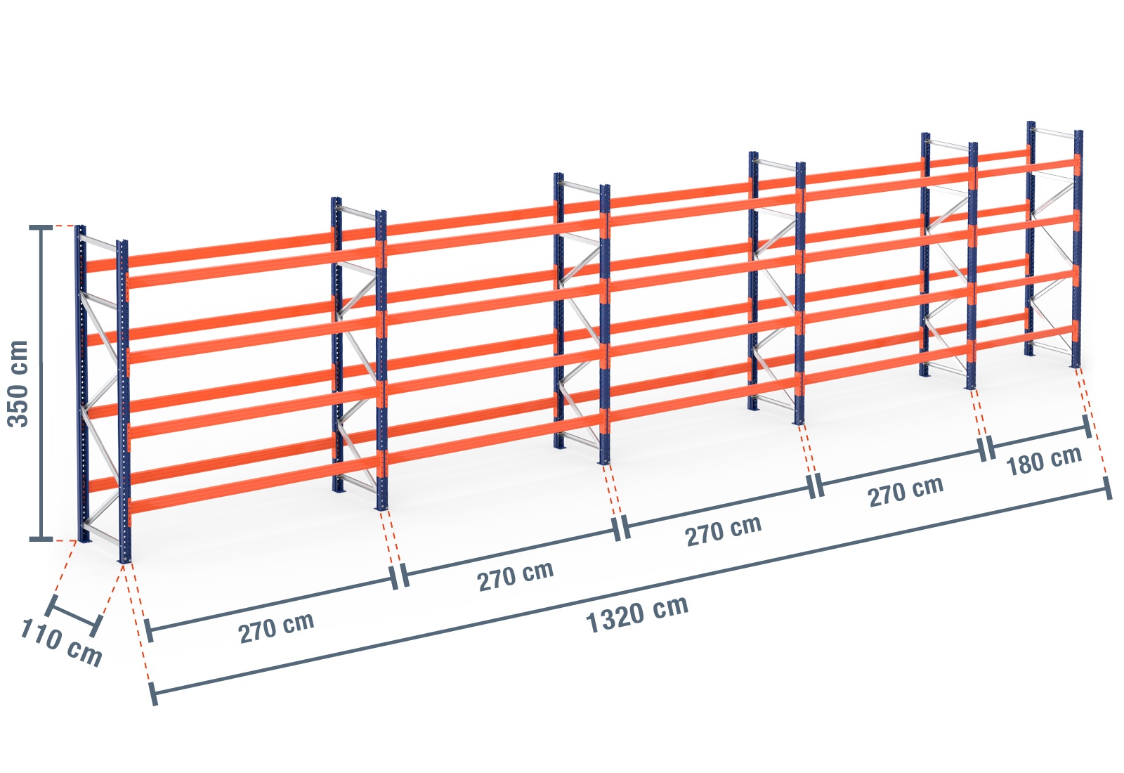 13,2 m scaffale portapallet PR9000 / 110 cm di profondità / 3,5 m di altezza / 4 livelli per 70 europallet