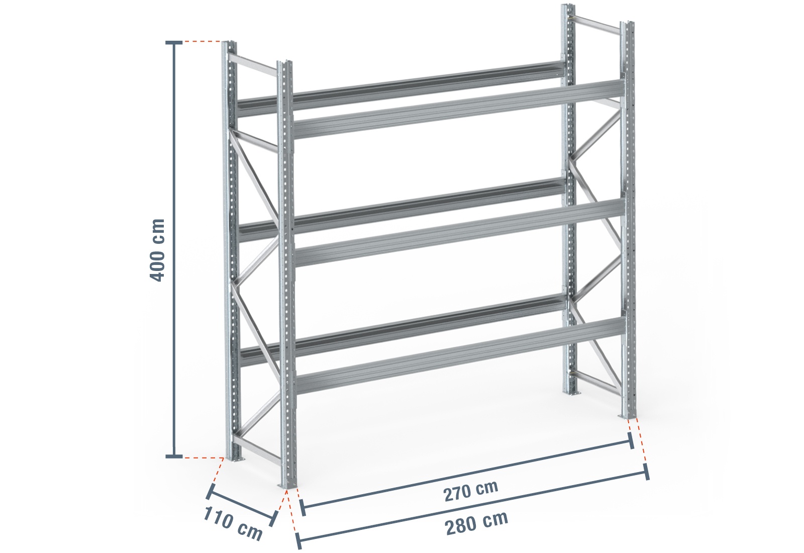 2,8 m scaffale portapallet PR9000F zincato a caldo / 110 cm profondità / 4 m altezza / 3 livelli per 12 europallet