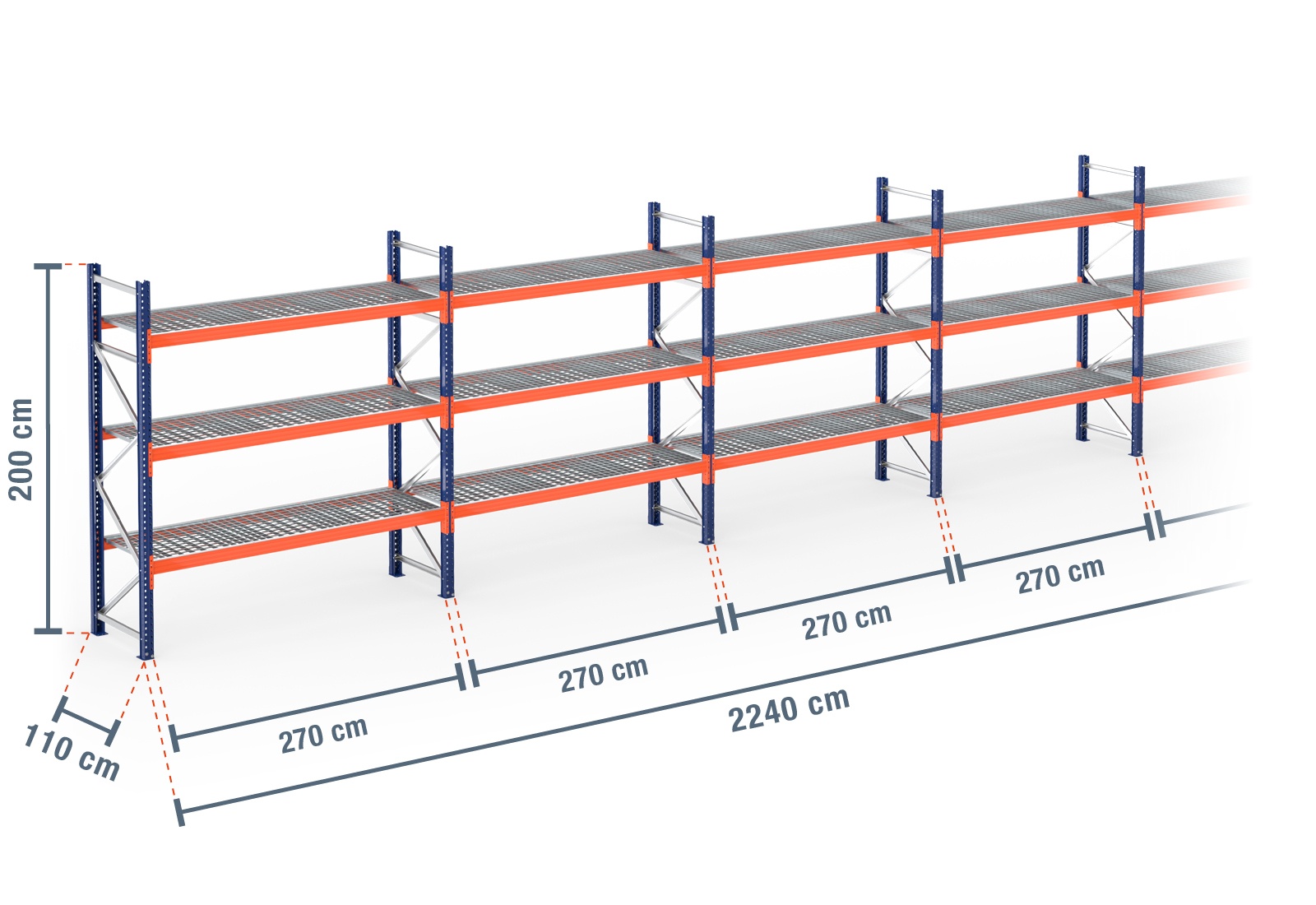 22,4 m scaffale portapallet da PR9000 / 110 cm profondità / 2 m altezza / 3 livelli / supporto grigliato