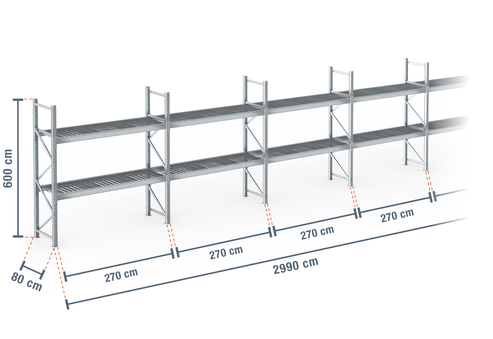 29,9 m scaffale portapallet PR9000F zincato a caldo / 80 cm profondità / 6 m altezza / 2 livelli / supporto grigliato