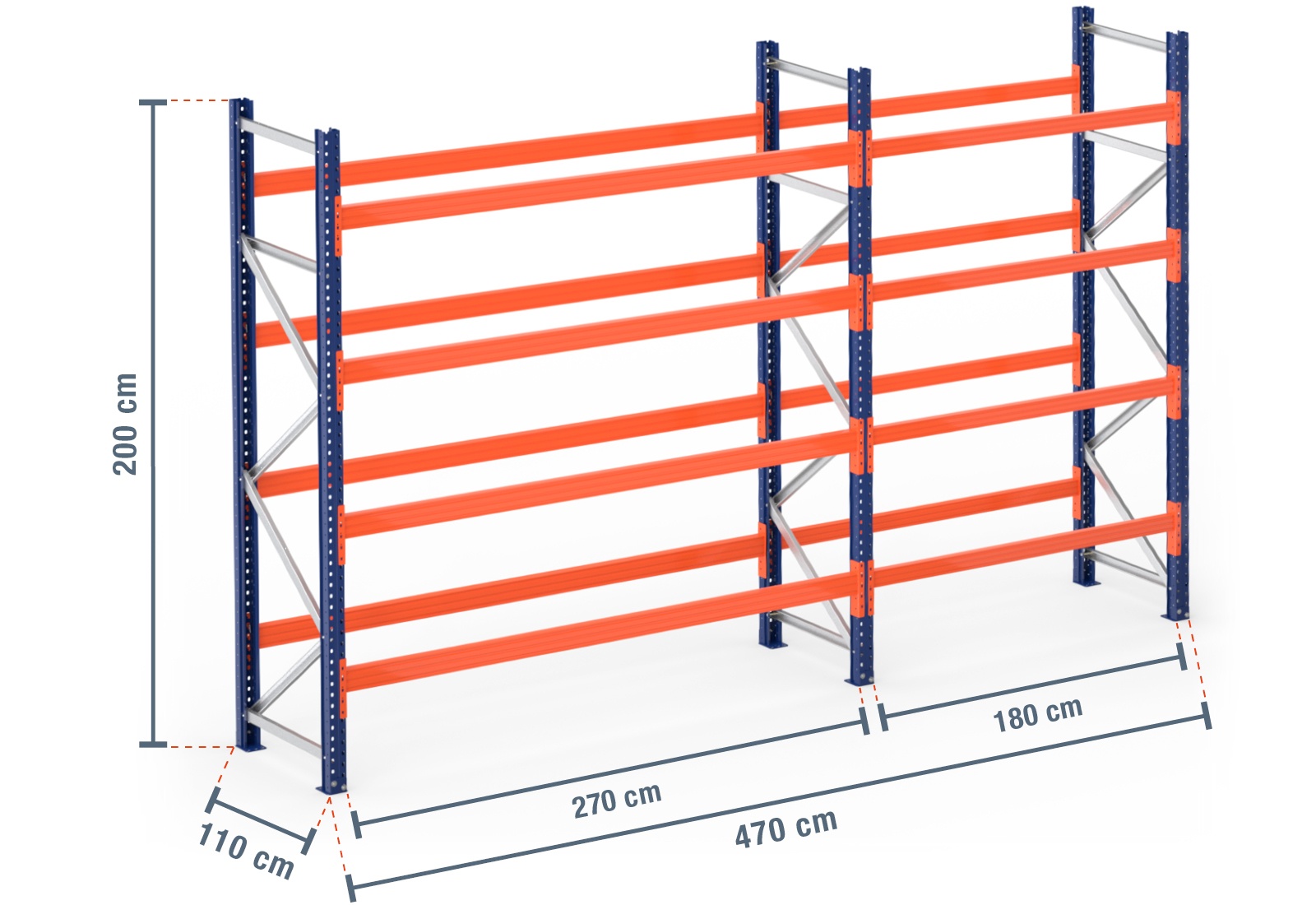 4,7 m scaffale portapallet PR9000 / 110 cm di profondità / 2 m di altezza / 4 livelli per 25 europallet