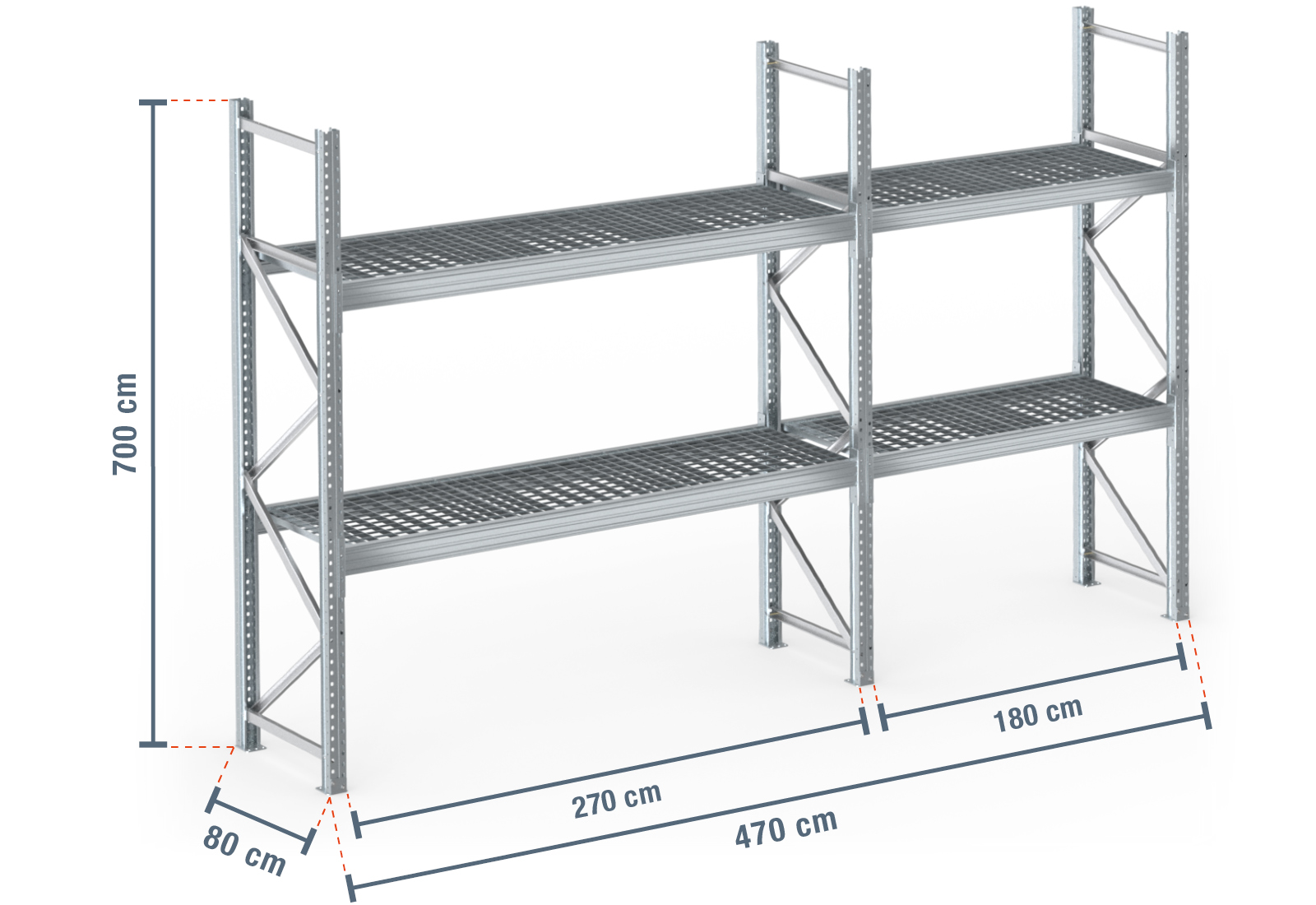 4,7 m scaffale portapallet PR9000F zincato a caldo / 80 cm profondità / 7 m altezza / 2 livelli / supporto grigliato