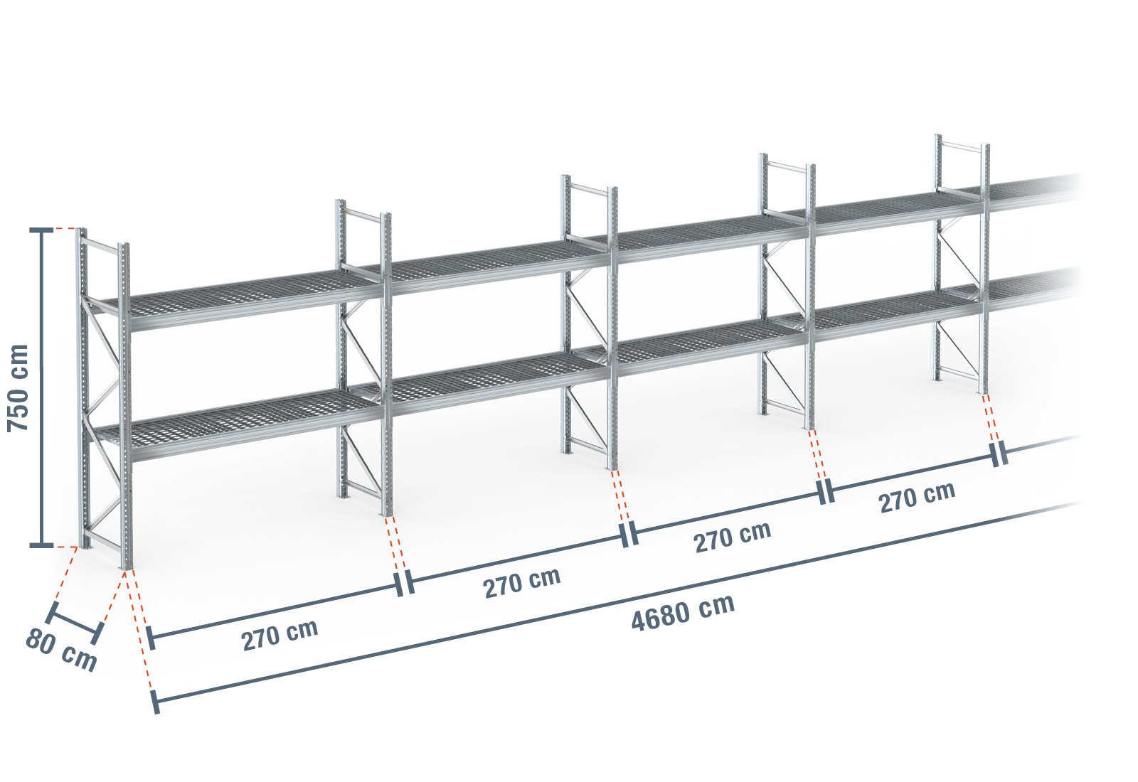 46,8 m scaffale portapallet PR9000F zincato a caldo / 80 cm profondità / 7,5 m altezza / 2 livelli / supporto grigliato