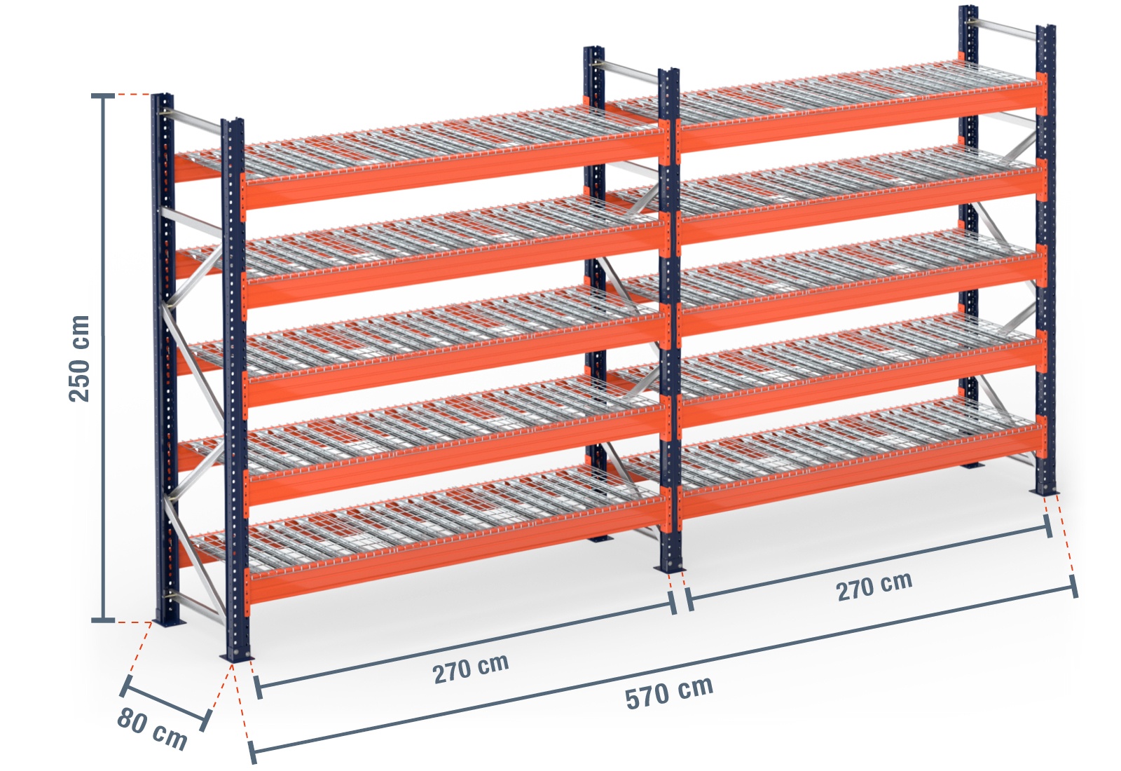 5,7 m scaffale portapallet da PR15000 / 80 cm profondità / 2,5 m altezza / 5 livelli / supporto rete metallica