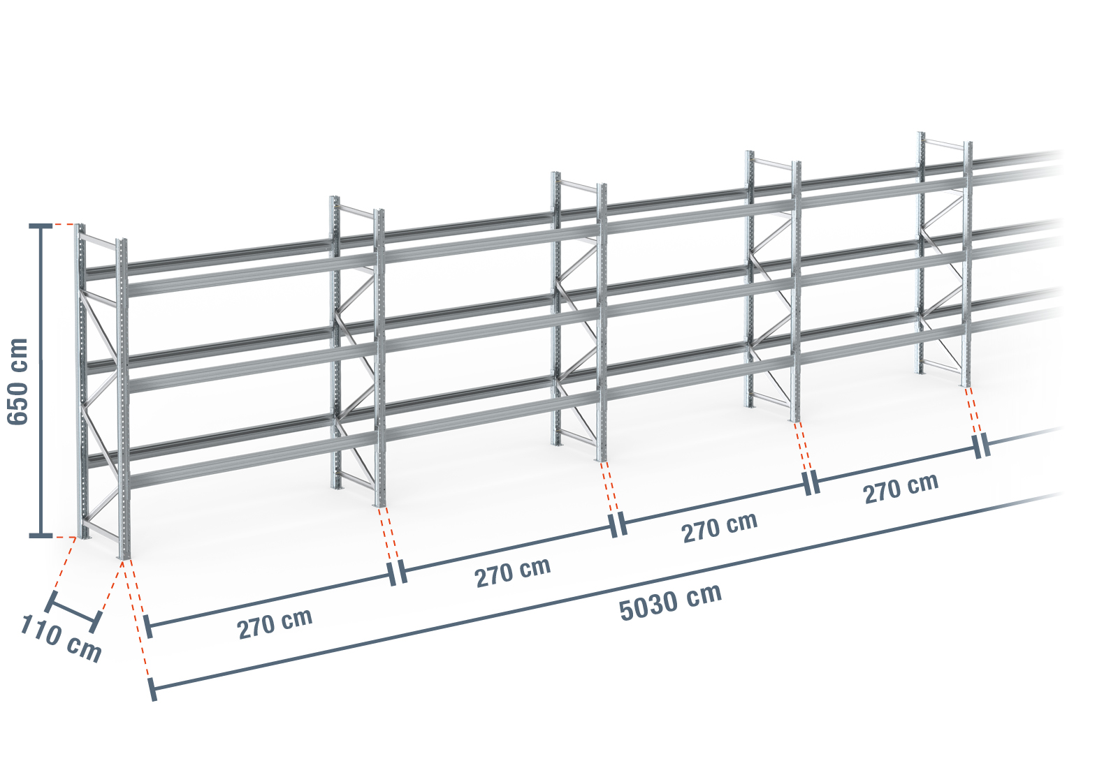 50,3 m scaffale portapallet PR9000F zincato a caldo / 110 cm profondità / 6,5 m altezza / 3 livelli per 216 europallet