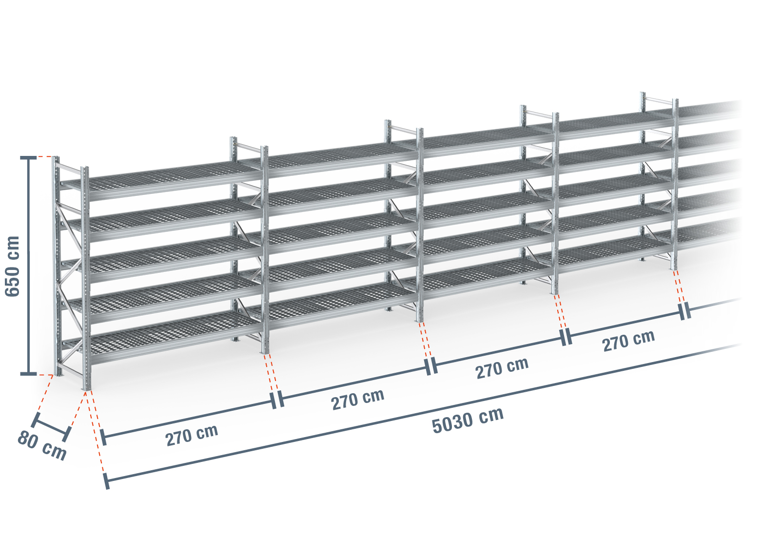 50,3 m scaffale portapallet PR9000F zincato a caldo / 80 cm profondità / 6,5 m altezza / 5 livelli / supporto grigliato