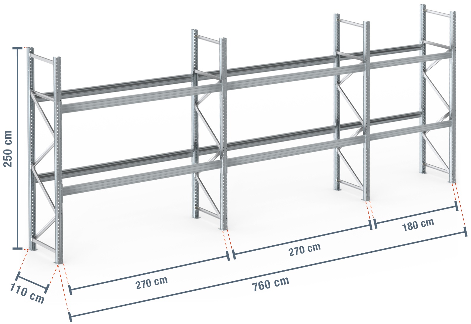 7,6 m scaffale portapallet PR9000F zincato a caldo / 110 cm profondità / 2,5 m altezza / 2 livelli per 24 europallet