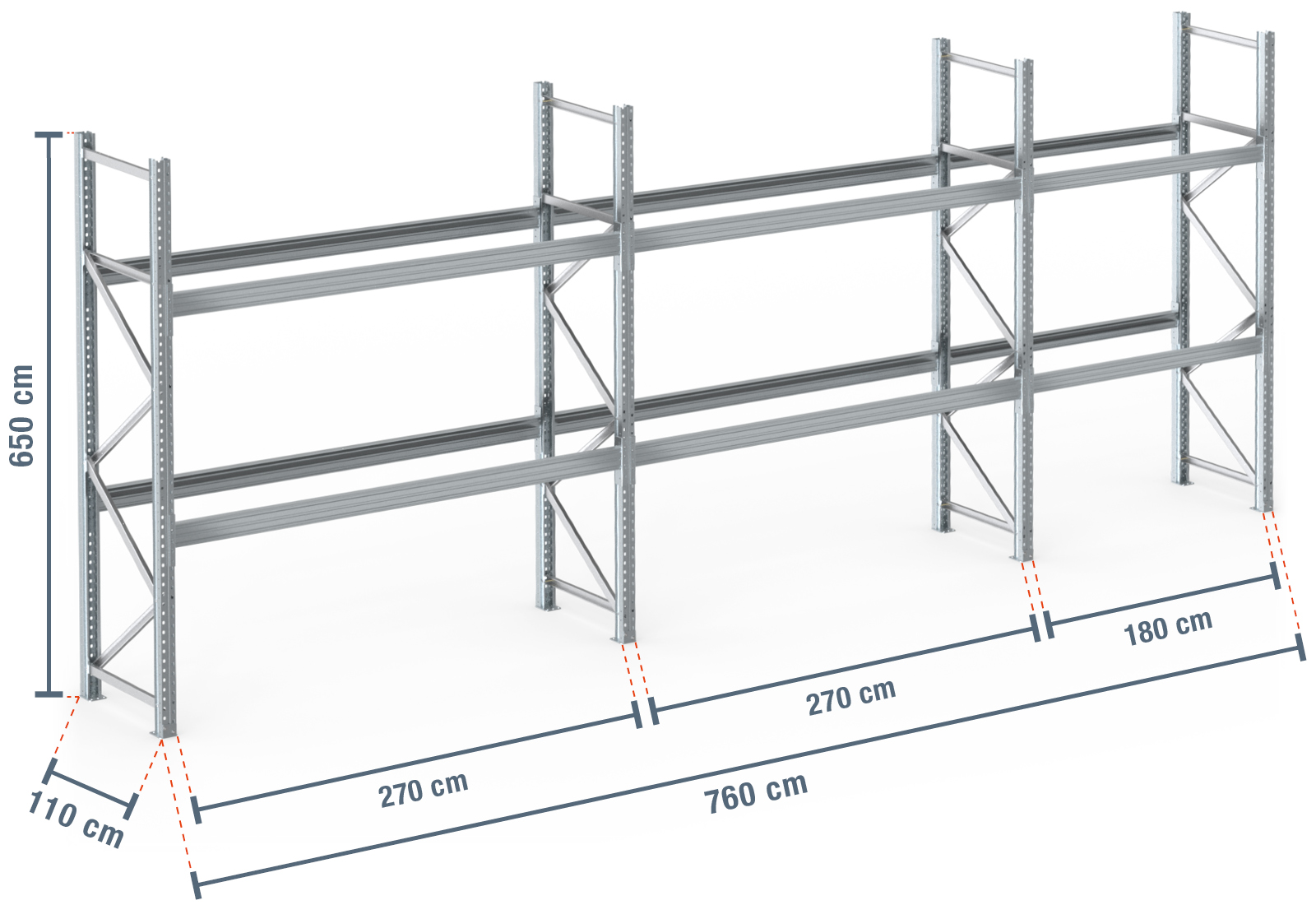 7,6 m scaffale portapallet PR9000F zincato a caldo / 110 cm profondità / 6,5 m altezza / 2 livelli per 24 europallet