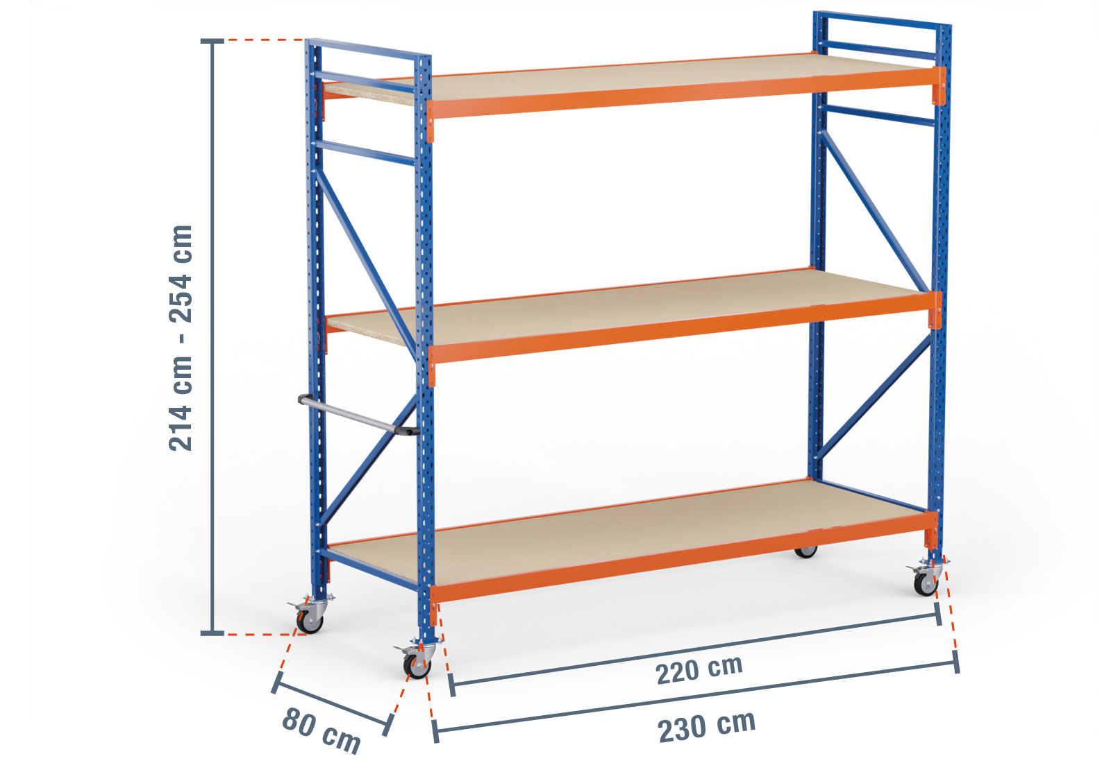 2,3 m scaffale di stoccaggio mobile LR2000 / 80 cm profondità / 2.140 - 2.540 mm altezza / 3 livelli / supporti legno