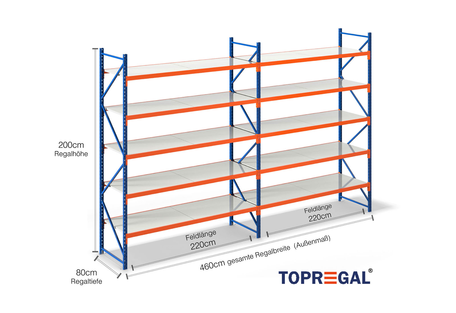 Gli scaffali di stoccaggio di TOPREGAL soddisfano ogni esigenza grazie alla loro stabilità e varietà. I nostri scaffali a grande portata si distinguono per un carico su campo (carico complessivo distribuito in modo uniforme tra 2 sostegni) di 2.000 kg e un carico a scaffale di 500 kg. In questo modo è possibile immagazzinarvi merci differenti, nonché articoli ingombrati e pesanti.