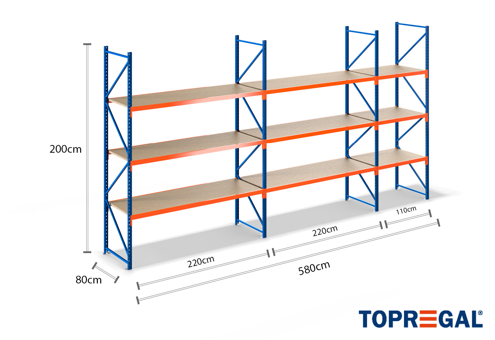5,8 m scaffale di stoccaggio LR2000 / 80 cm profondità / 2 m altezza / 3 livelli / supporti legno