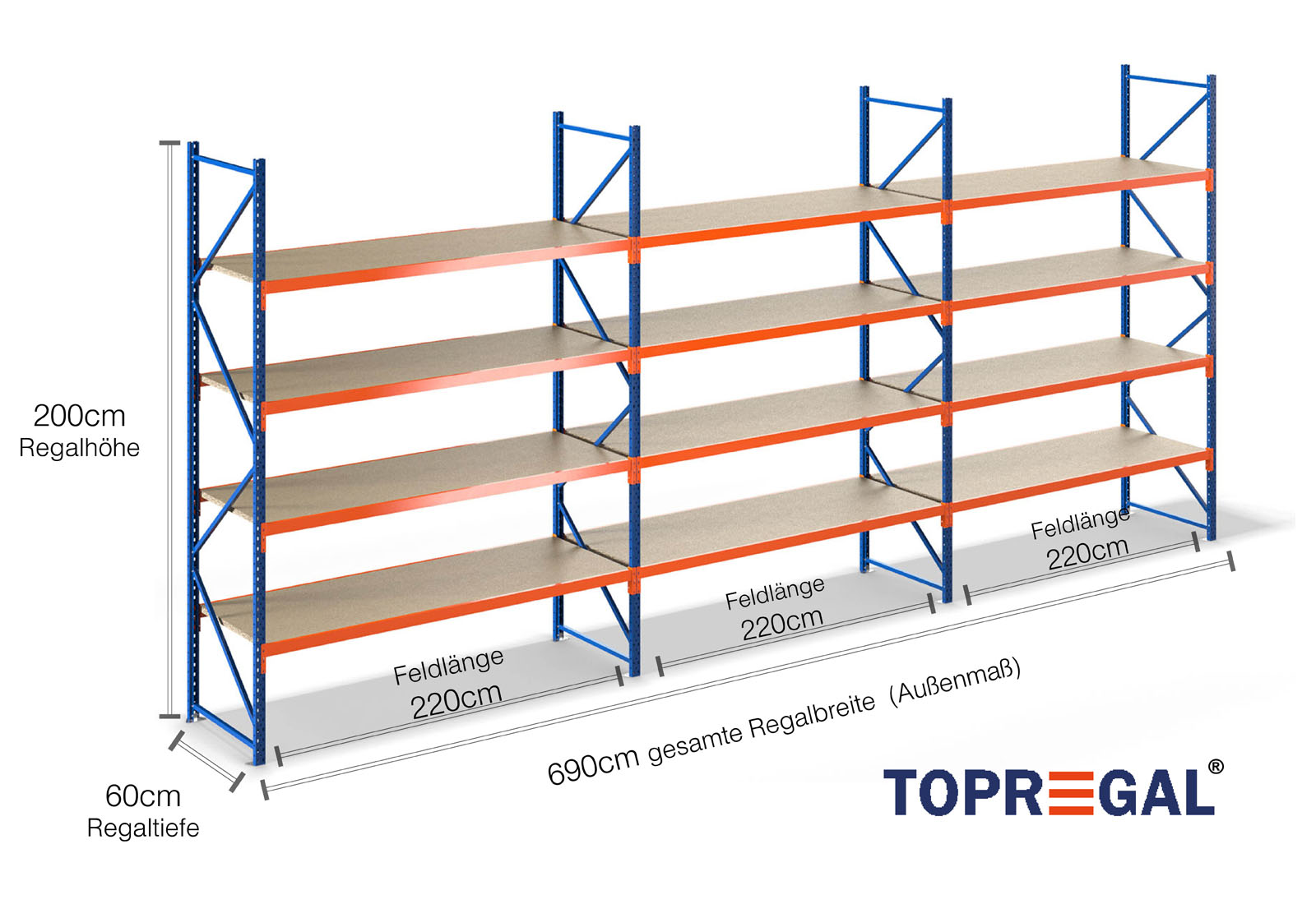 Gli scaffali di stoccaggio di TOPREGAL soddisfano ogni esigenza grazie alla loro stabilità e varietà. I nostri scaffali a grande portata si distinguono per un carico su campo (carico complessivo distribuito in modo uniforme tra 2 sostegni) di 2.000 kg e un carico a scaffale di 500 kg. In questo modo è possibile immagazzinarvi merci differenti, nonché articoli ingombrati e pesanti.