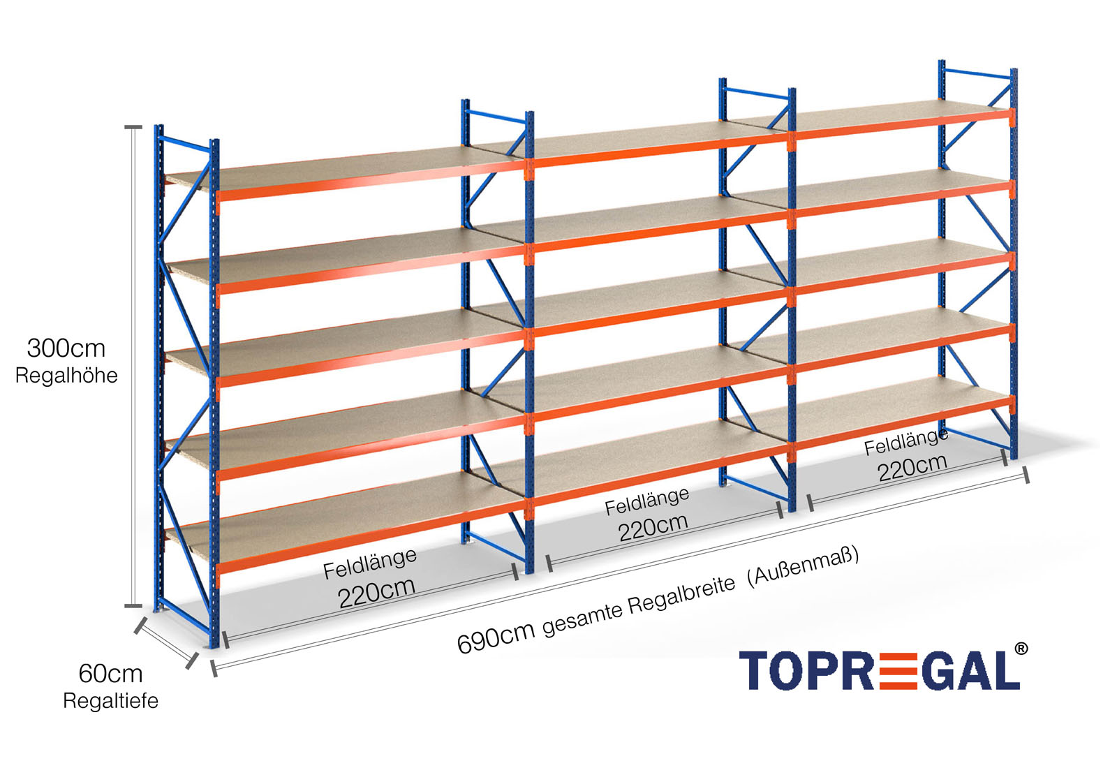 6,9 m scaffale di stoccaggio LR2000 / 60 cm profondità / 3 m altezza / 5 livelli / supporti legno