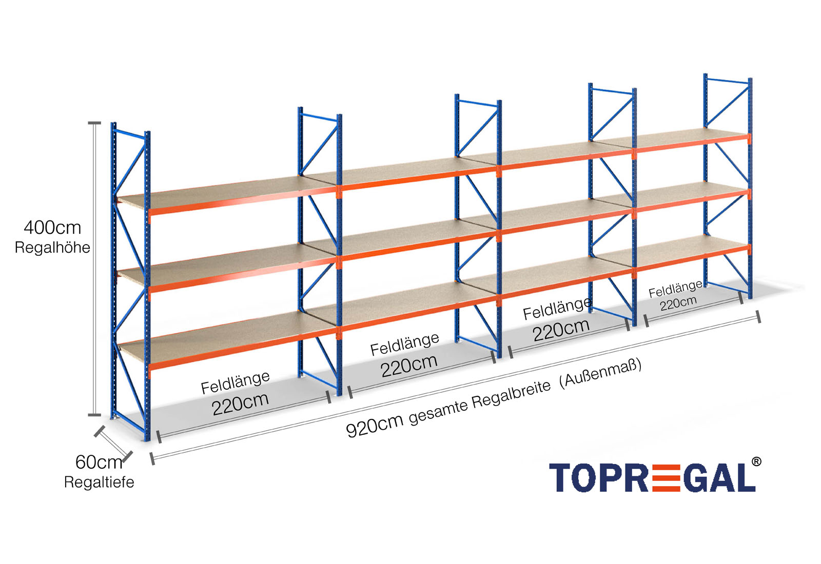 9,2 m scaffale di stoccaggio LR2000 / 60 cm profondità / 4 m altezza / 3 livelli / supporti legno