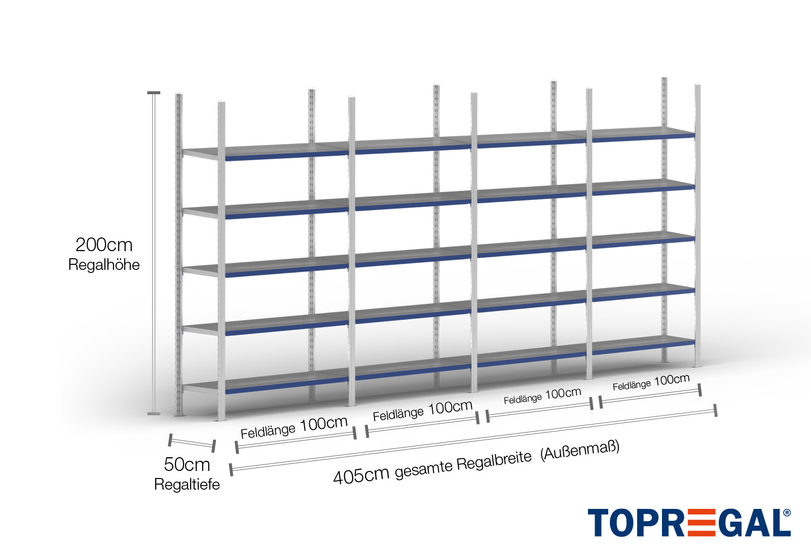 4 m scaffale metallico FB200 / 50 cm profondità / 2 m altezza / 5 livelli / supporti acciaio / carico a scaffale 200 kg