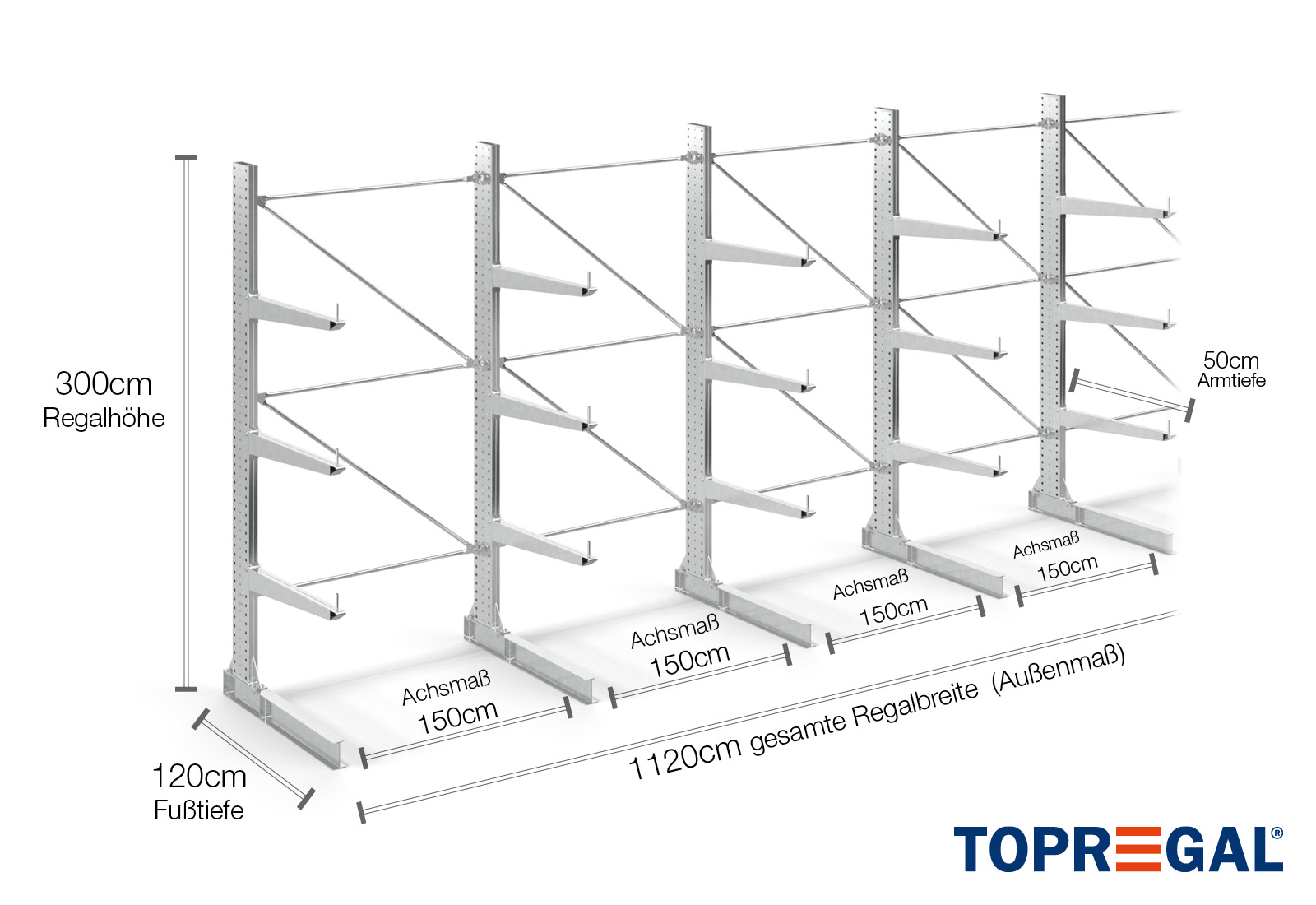 La dimensione dell'asse è la dimensione interna tra due montanti della mensola. A seconda del tipo di braccio a sbalzo, offriamo queste campate in 120 cm (KR2500) e in 100 cm / 150 cm (KR3000 / KR6000).