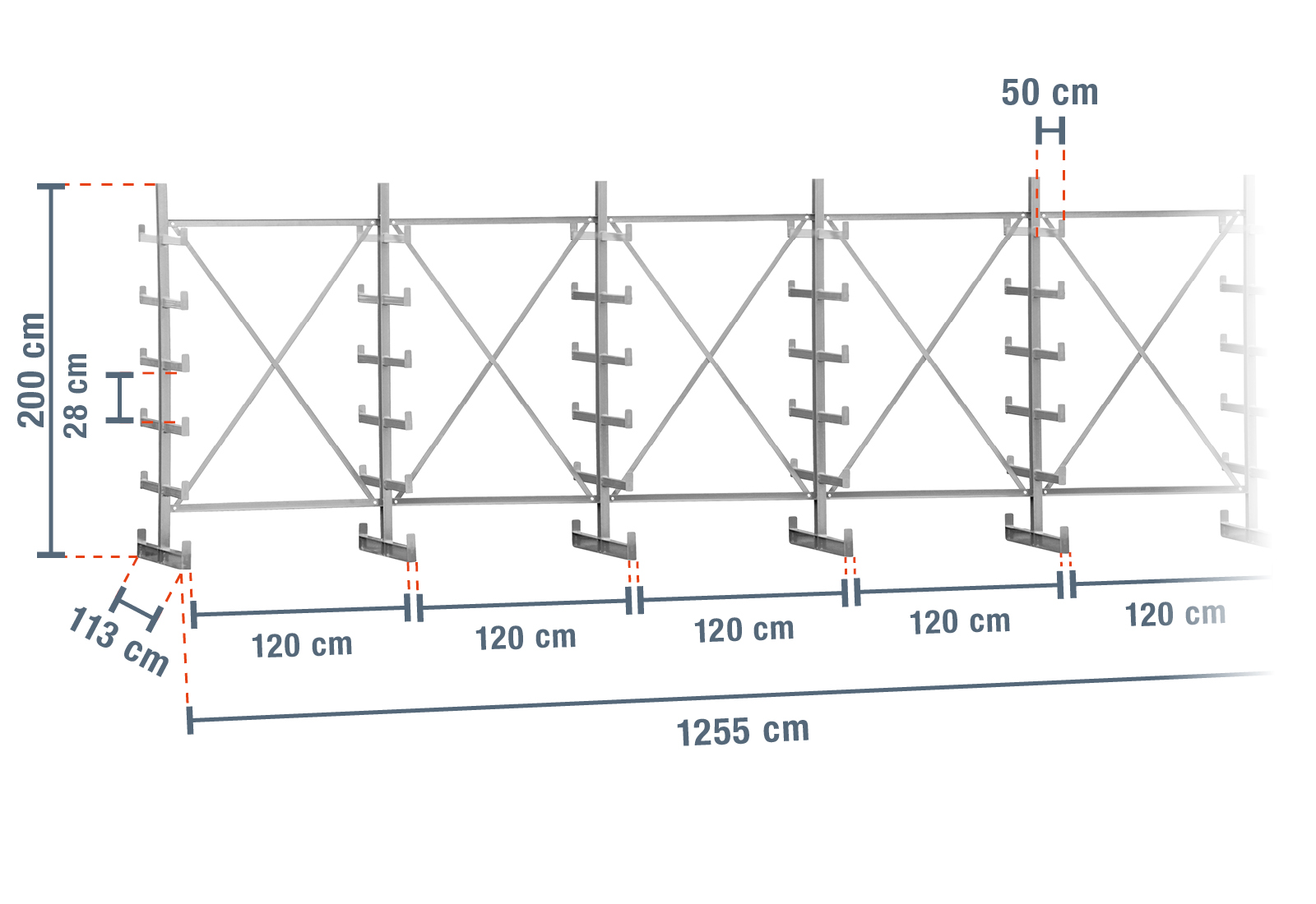 Questo scaffale a sbalzo particolarmente robusto ha una larghezza di 12,55 m, un’altezza di 2 m e 5 livelli con una profondità del braccio di 50 cm. Grazie alla versione su due lati con bracci a sbalzo saldati, ogni sostegno può sopportare un carico massimo di 2.500 kg, mentre il carico massimo di ogni braccio è di 250 kg.