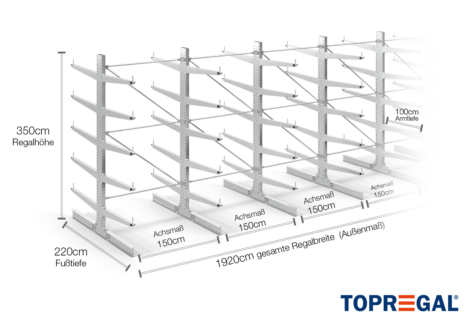 La versione dello scaffale a sbalzo su due lati ha una larghezza di 19,2 m, un’altezza di 3,5 m e una profondità complessiva di 220 cm. Inoltre dispone di 5 livelli del braccio a sbalzo con una profondità del braccio di 100 cm. Il carico massimo per braccio è di 500 kg. I bracci a sbalzo possono essere agganciati singolarmente in incrementi di 50 mm e sono fissati con bulloni e perni di bloccaggio. Anche le sezioni della base possono essere utilizzate come livello di stoccaggio (a seconda della merce). Per impedire la caduta accidentale del carico, è possibile inserire un dispositivo di sicurezza all’estremità di ogni braccio a sbalzo. Il dispositivo è incluso nella fornitura.