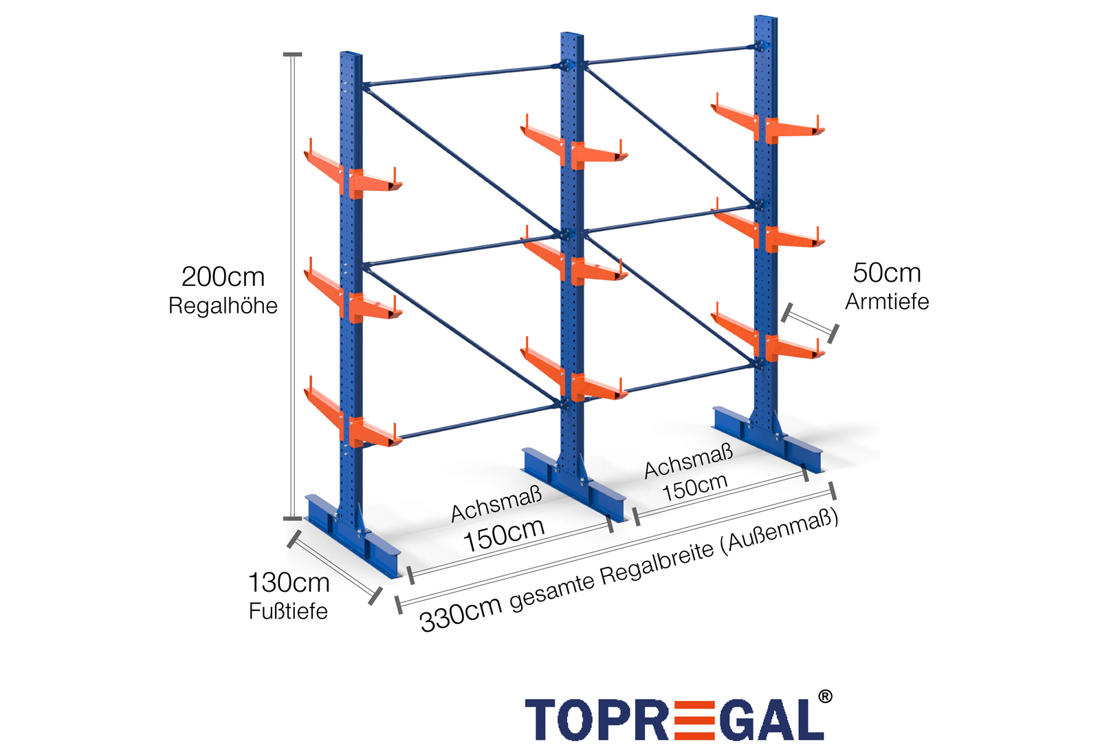 La versione dello scaffale a sbalzo su due lati ha una larghezza di 3,3 m, un’altezza di 2 m e una profondità complessiva di 120 cm. Inoltre dispone di 3 livelli del braccio a sbalzo con una profondità del braccio di 50 cm. Il carico massimo per braccio è di 500 kg. I bracci a sbalzo possono essere agganciati singolarmente in incrementi di 50 mm e sono fissati con bulloni e perni di bloccaggio. Anche le sezioni della base possono essere utilizzate come livello di stoccaggio (a seconda della merce). Per impedire la caduta accidentale del carico, è possibile inserire un dispositivo di sicurezza all’estremità di ogni braccio a sbalzo. Il dispositivo è incluso nella fornitura.