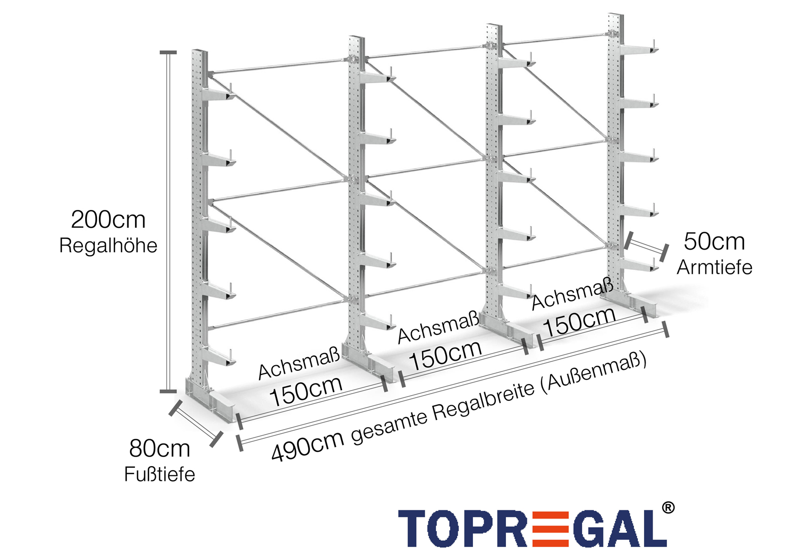 La versione dello scaffale a sbalzo su un lato ha una larghezza di 4,9 m, un’altezza di 2 m e una profondità complessiva di 80 cm. Inoltre dispone di 5 livelli del braccio a sbalzo con una profondità del braccio di 50 cm. Il carico massimo per braccio è di 500 kg. I bracci a sbalzo possono essere agganciati singolarmente in incrementi di 50 mm e sono fissati con bulloni e perni di bloccaggio. Anche le sezioni della base possono essere utilizzate come livello di stoccaggio (a seconda della merce). Per impedire la caduta accidentale del carico, è possibile inserire un dispositivo di sicurezza all’estremità di ogni braccio a sbalzo. Il dispositivo è incluso nella fornitura.
