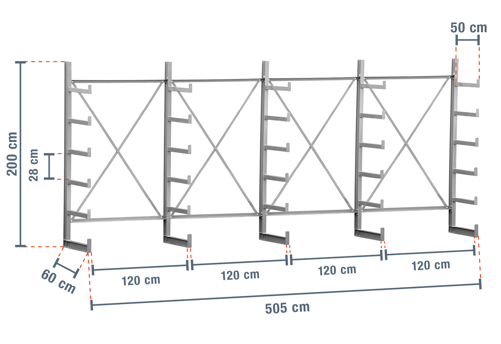 Questo scaffale a sbalzo particolarmente robusto ha una larghezza di 5,05 m, un’altezza di 2 m e 5 livelli con una profondità del braccio di 50 cm. Grazie alla versione su un solo lato con bracci a sbalzo saldati, ogni sostegno può sopportare un carico massimo di 1.250 kg, mentre il carico massimo di ogni braccio è di 250 kg.