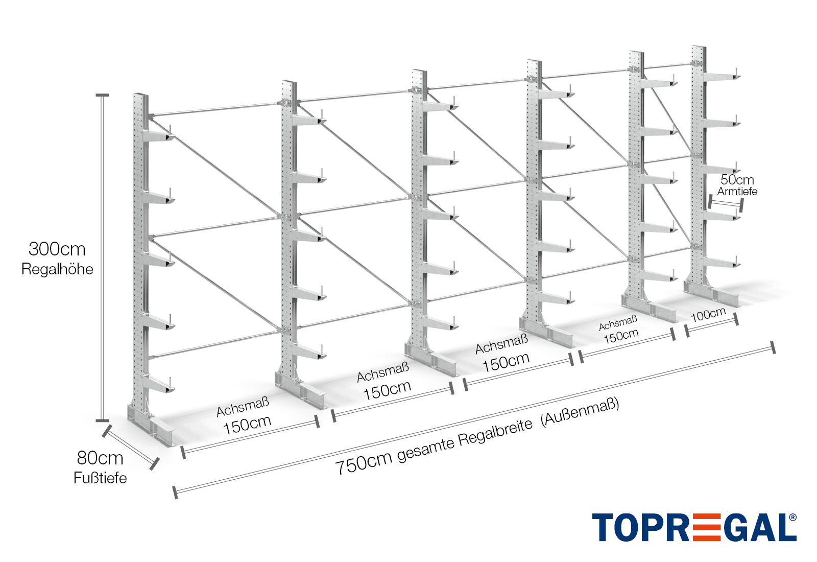 La versione dello scaffale a sbalzo su un lato ha una larghezza di 7,5 m, un’altezza di 3 m e una profondità complessiva di 80 cm. Inoltre dispone di 5 livelli del braccio a sbalzo con una profondità del braccio di 50 cm. Il carico massimo per braccio è di 500 kg. I bracci a sbalzo possono essere agganciati singolarmente in incrementi di 50 mm e sono fissati con bulloni e perni di bloccaggio. Anche le sezioni della base possono essere utilizzate come livello di stoccaggio (a seconda della merce). Per impedire la caduta accidentale del carico, è possibile inserire un dispositivo di sicurezza all’estremità di ogni braccio a sbalzo. Il dispositivo è incluso nella fornitura.