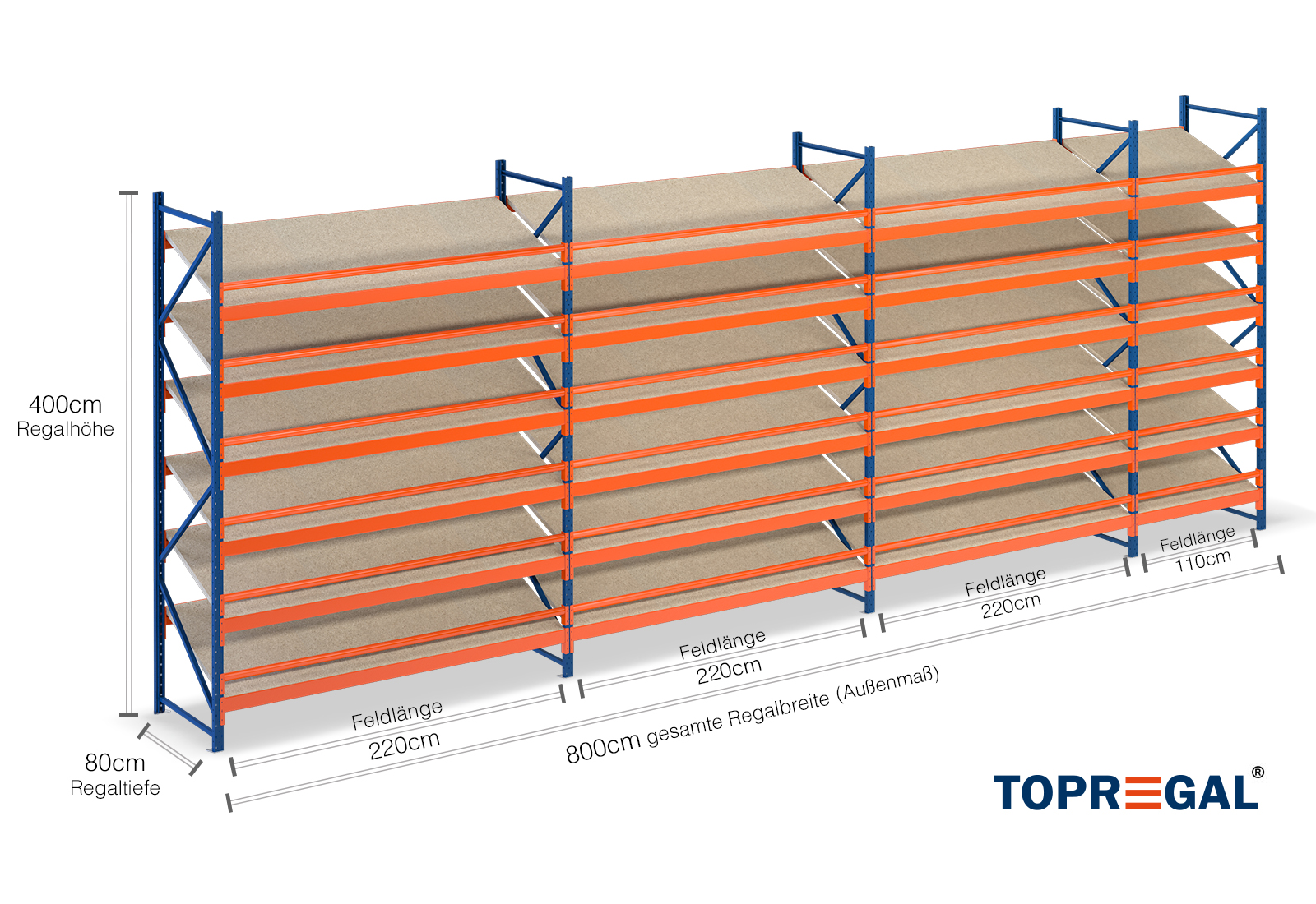 Tutti i dati si riferiscono a carichi uniformemente distribuiti. In caso di carico, il carico di scaffale e il carico di campo non devono essere superati. In linea di principio, durante l'uso si applicano le attuali linee guida sulla sicurezza e la salute sul lavoro (Regola DGUV tedesca 208-061). TOPREGAL non si assume alcuna responsabilità per incidenti/danni causati da un uso improprio. Il nostro team di consulenti esperti sarà lieto di rispondere alle vostre domande. Le dimensioni indicate sono approssimative e possono differire di qualche centimetro. Contattateci se avete bisogno delle dimensioni esatte del prodotto desiderato.