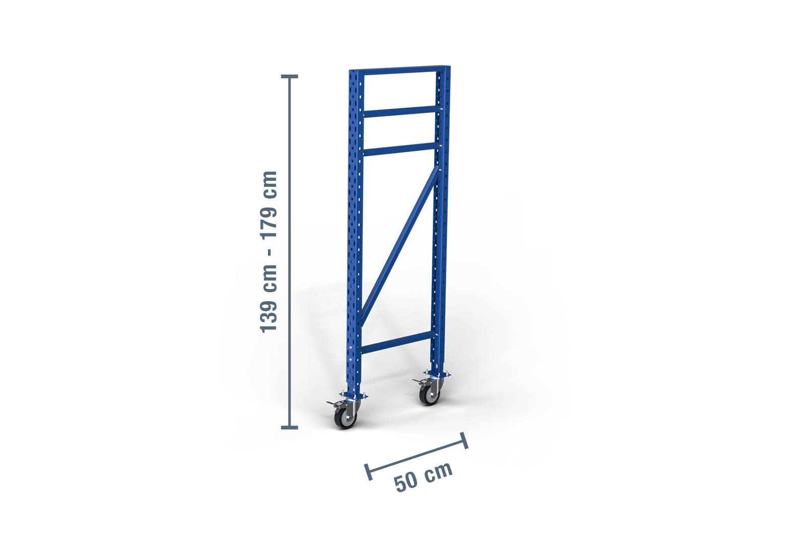 Questo sostegno per scaffale di stoccaggio è particolarmente funzionale, perché rende lo scaffale mobile. Lo scaffale, quindi, non è più fisso, ma può essere utilizzato come tavolo di lavoro mobile o postazione di imballaggio mobile. La regolabilità in altezza di 1.390 - 1.790 mm consente di adattare il sostegno dello scaffale a piani lunghi mobile all’altezza degli altri strumenti di lavoro o dell’utilizzatore, così da aumentare l’ergonomia. Inoltre, il sostegno dello scaffale di stoccaggio con ruote è profondo 50 cm. I livelli dello scaffale possono essere agganciati a piacere con incrementi di 50 mm.