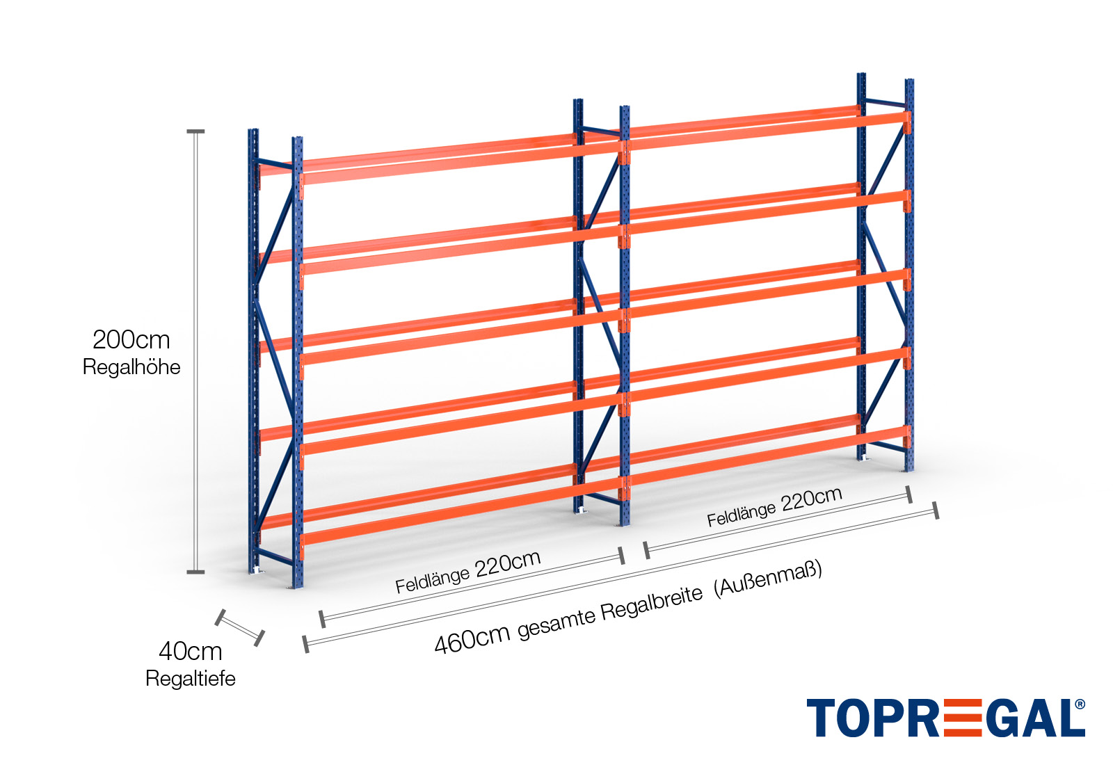 Il carico degli scaffali per pneumatici di TOPREGAL è pari a 400 kg per livello. Il carico sul campo, ossia il carico complessivo distribuito in modo uniforme tra 2 sostegni, è di 2.000 kg.