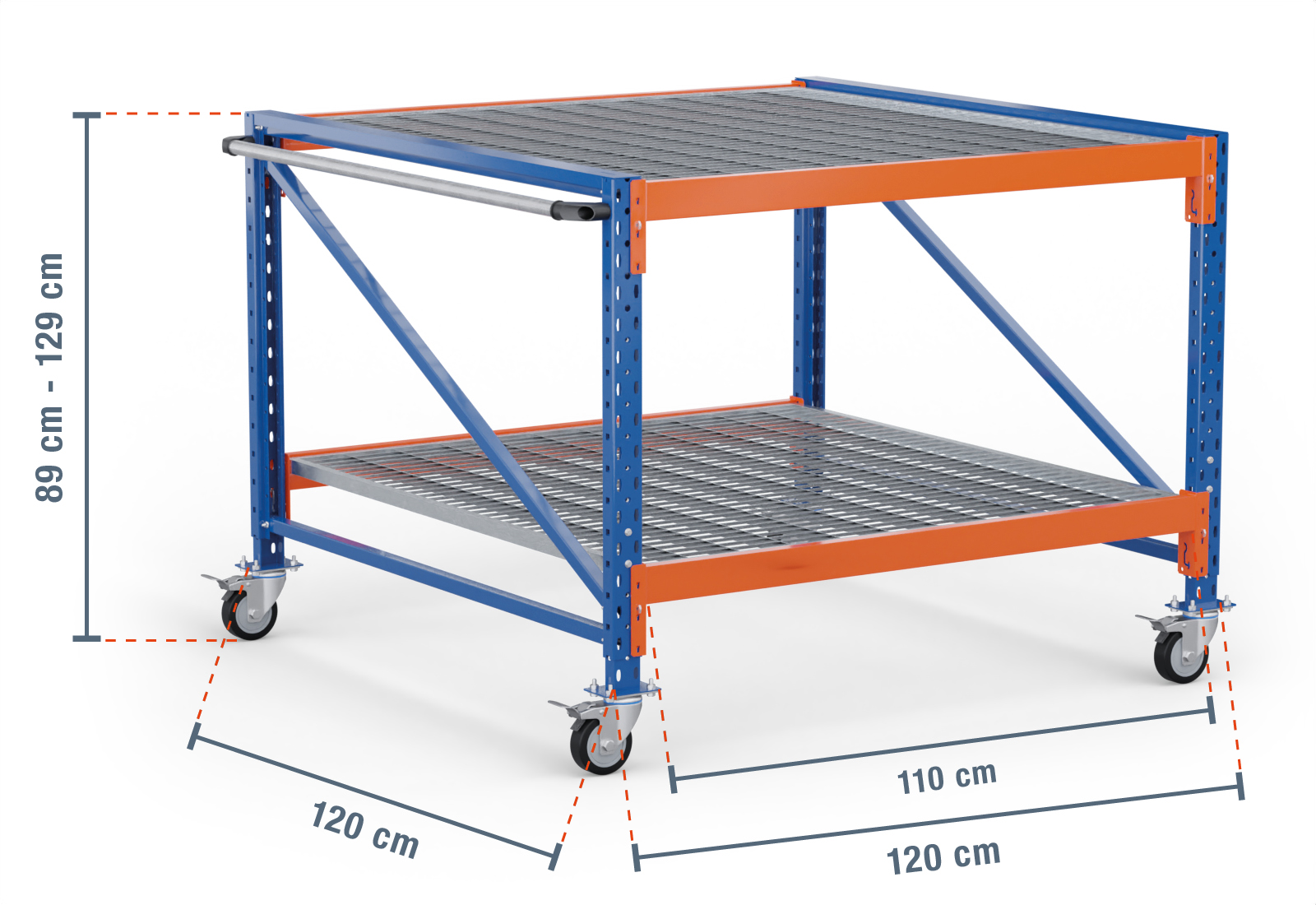 1,2 m tavolo di lavoro mobile MFW1000-AT / 120 cm profondità / 890 - 1.290 mm altezza / 2 livelli / supporto grigliato