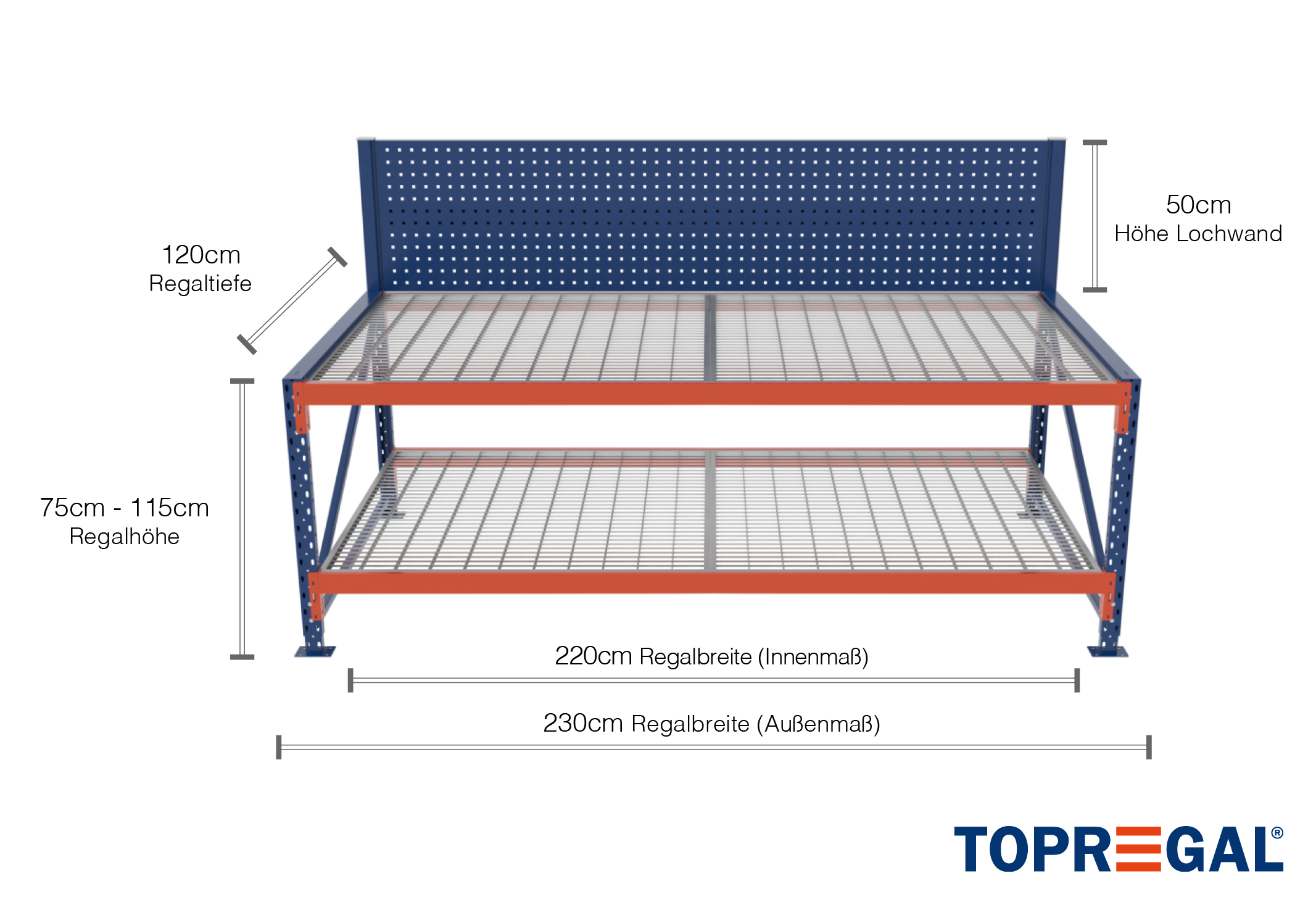 - 1 x scaffale di stoccaggio con parete posteriore forata da 220 cm di larghezza, 50 cm di altezza