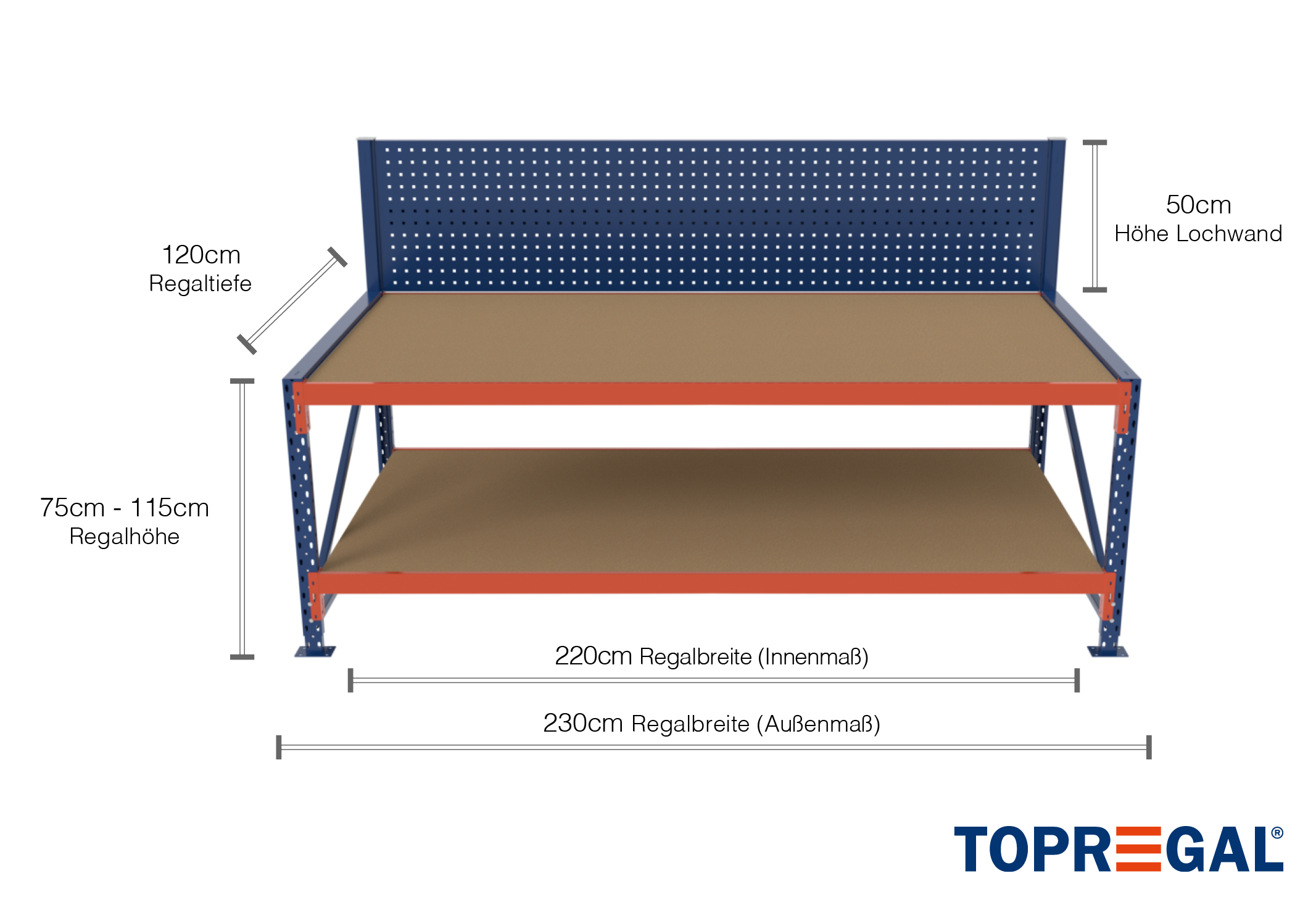 - 1 x scaffale di stoccaggio con parete posteriore forata da 220 cm di larghezza, 50 cm di altezza